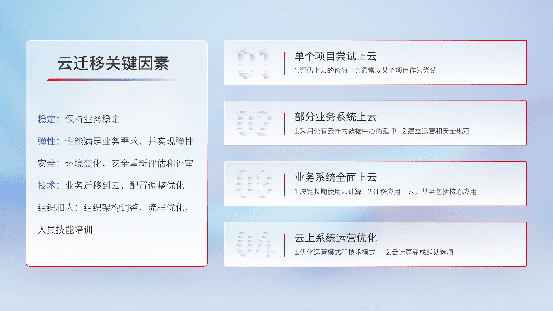 结合实际业务,,,从规划设计、、云平台选型、、、云原生改造、、、数据迁移、、集成交付,,迁移全过程为客户识别最佳上云路径,,做好风险识别管理,,,,设计网络架构、、、、身份权限、、、安全审计合规、、、操作审计、、、、日志审计、、、、监控告警策略、、、多站点容灾设计等,,对云上基础设施进行整体规划,,提升IT治理水平,,,,以满足弹性、、高可用、、、、高性能的需求。。。。