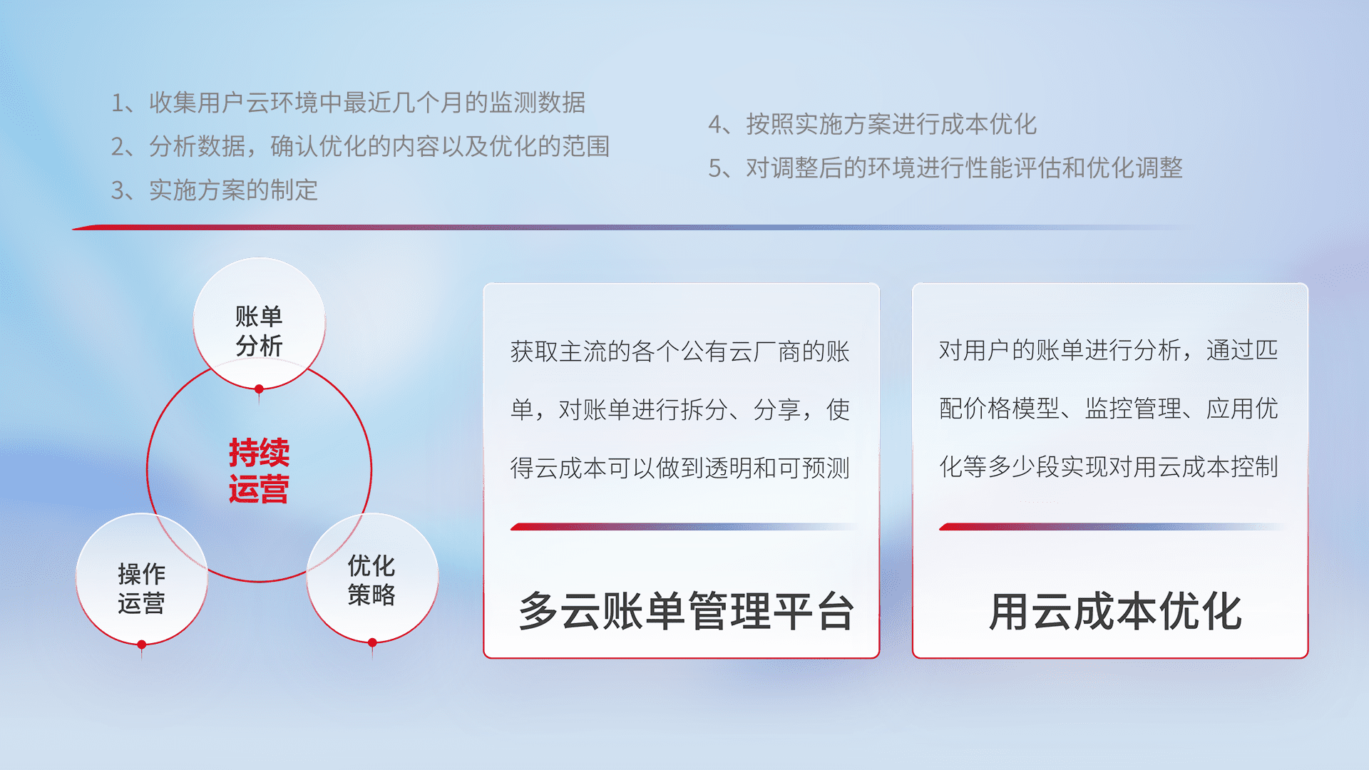 通过多云纳管,,,,以统一的资源数据模型把客户的云资源进行抽象和封装,,进而实现对多云资源的统一操作,,,,保障云资源管理的可靠性、、稳定性与可用性。。。量身定制化运维内容,,配置、、、开发运维、、补丁管理、、、备份、、、监控、、、认证和访问管理、、、审计和日常巡检等,,,保障在用云过程中的可靠度,,稳定度以及高可用率。。。。